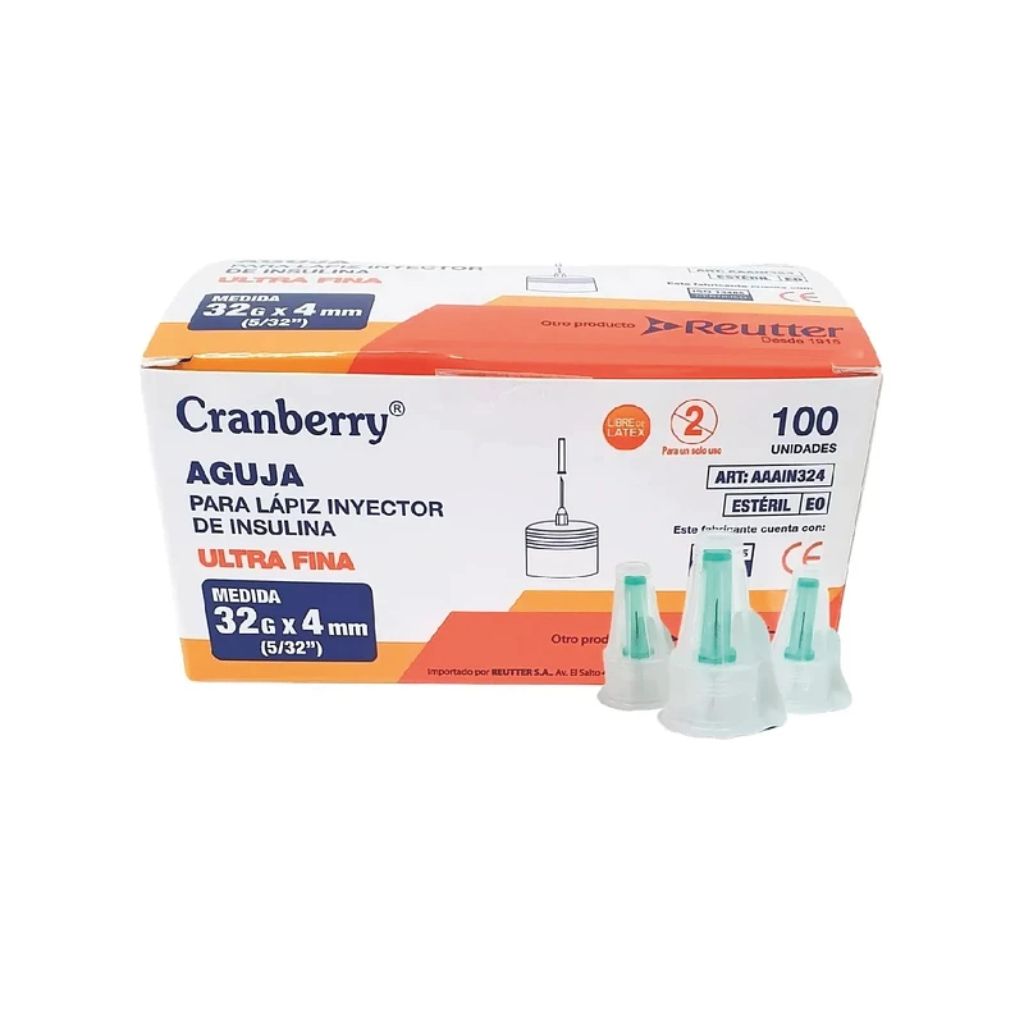 Aguja Lápiz Insulina Cranberry 32G x 4mm Unidad, aguja para insulina Cranberry, diseñada para la administración subcutánea de insulina con precisión y seguridad.